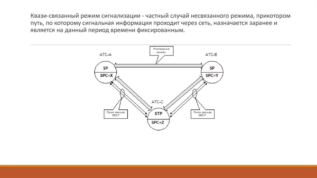 Квази-связанный режим сигнализации - частный случай несвязанного режима, прикоторомпуть, по которому сигнальная информация проходит через сеть, назначается заранее и