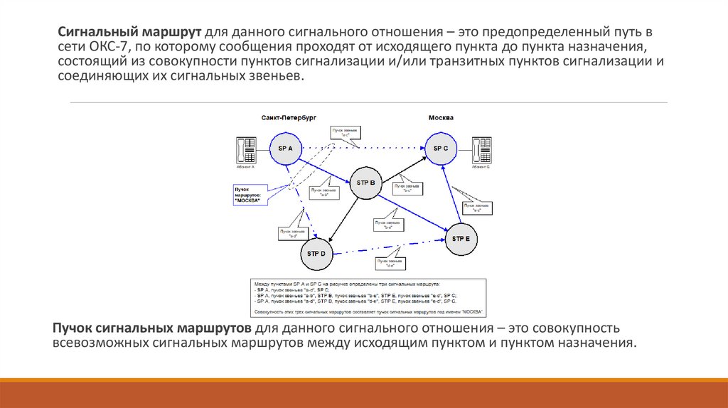 Сигнальный маршрут для данного сигнального отношения – это предопределенный путь всети ОКС-7, по которому сообщения проходят от исходящего пункта до пункта назначения,