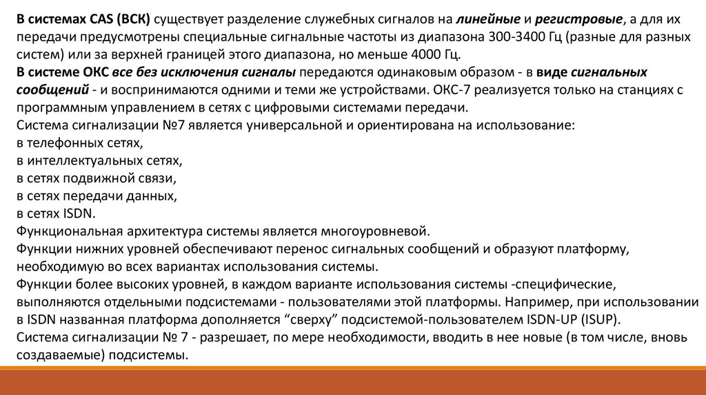 В системах CAS (ВСК) существует разделение служебных сигналов на линейные и регистровые, а для ихпередачи предусмотрены специальные сигнальные частоты из диапазона 300-3400 Гц (разные для разных