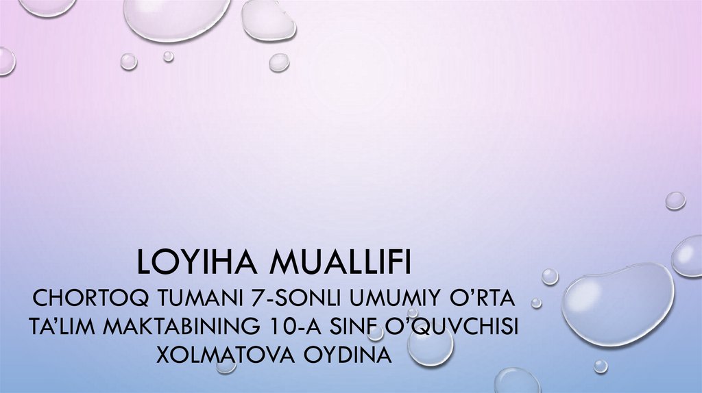 1. loyiha muallifi chortoq tumani 7-sonli umumiy o’rta ta’lim maktabining 10-A sinf o’quvchisi xolmatova oydina