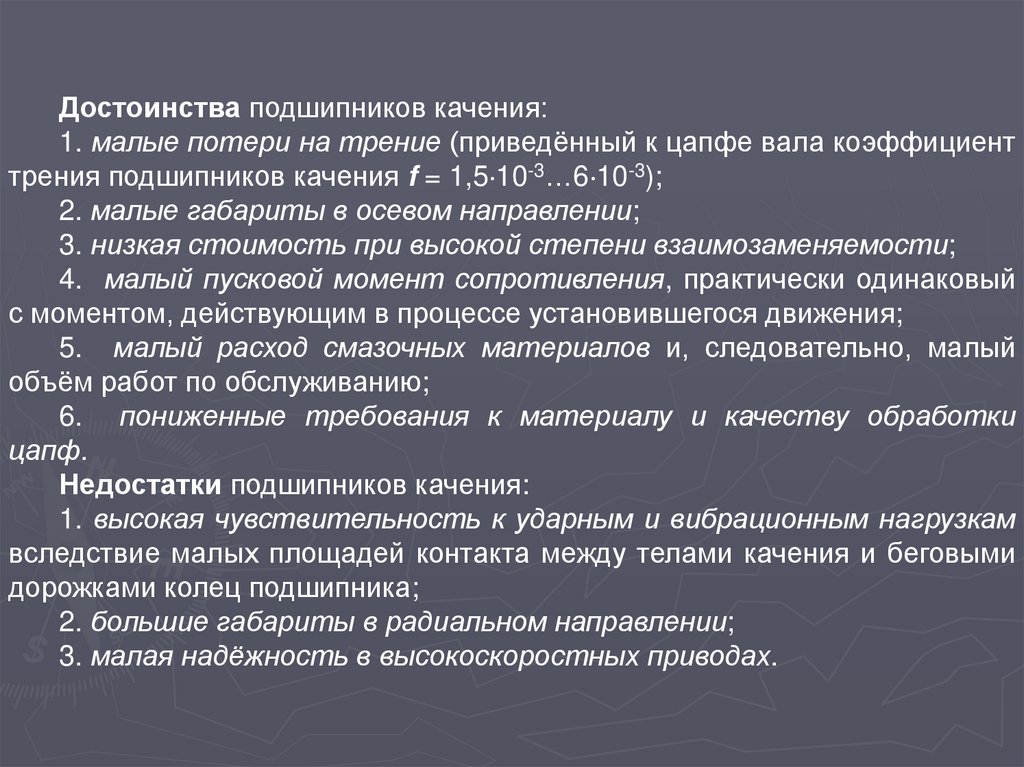 Достоинства подшипников качения:1. малые потери на трение (приведённый к цапфе вала коэффициент