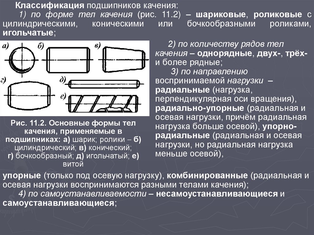 Классификация подшипников качения:1) по форме тел качения (рис. 11.2) – шариковые, роликовые с