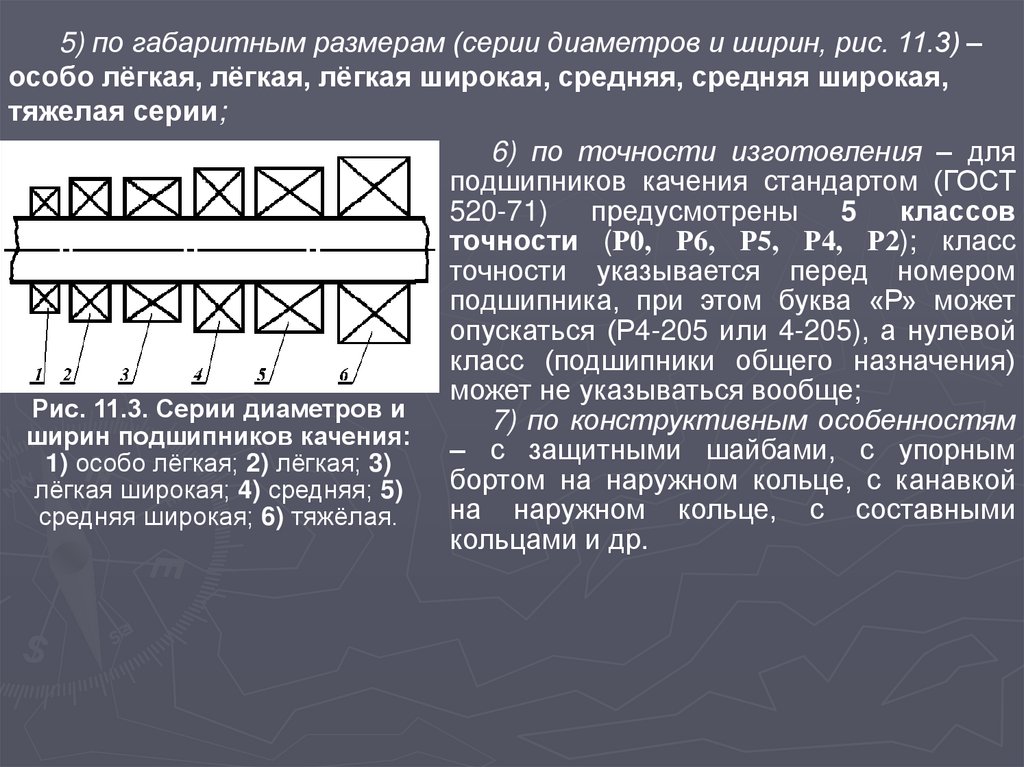 5) по габаритным размерам (серии диаметров и ширин, рис. 11.3) –особо лёгкая, лёгкая, лёгкая широкая, средняя, средняя широкая,