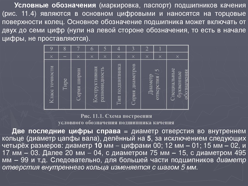 Условные обозначения (маркировка, паспорт) подшипников качения(рис. 11.4) являются в основном цифровыми и наносятся на торцовые