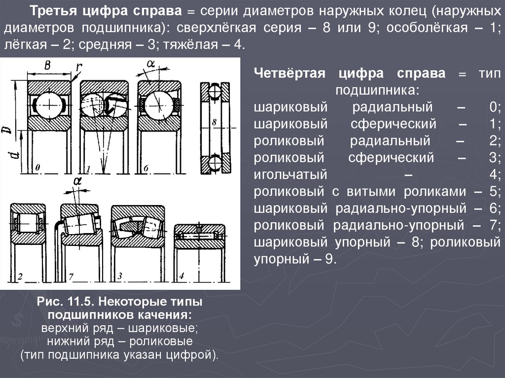 Третья цифра справа = серии диаметров наружных колец (наружныхдиаметров подшипника): сверхлёгкая серия – 8 или 9; особолёгкая – 1;
