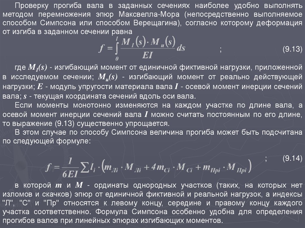 Проверку прогиба вала в заданных сечениях наиболее удобно выполнятьметодом перемножения эпюр Максвелла-Мора (непосредственно выполняемое