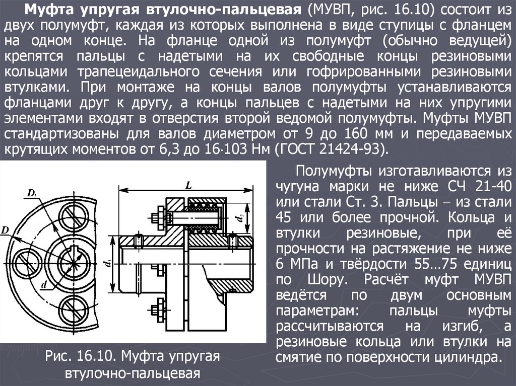 Муфта упругая втулочно-пальцевая (МУВП, рис. 16.10) состоит издвух полумуфт, каждая из которых выполнена в виде ступицы с фланцем