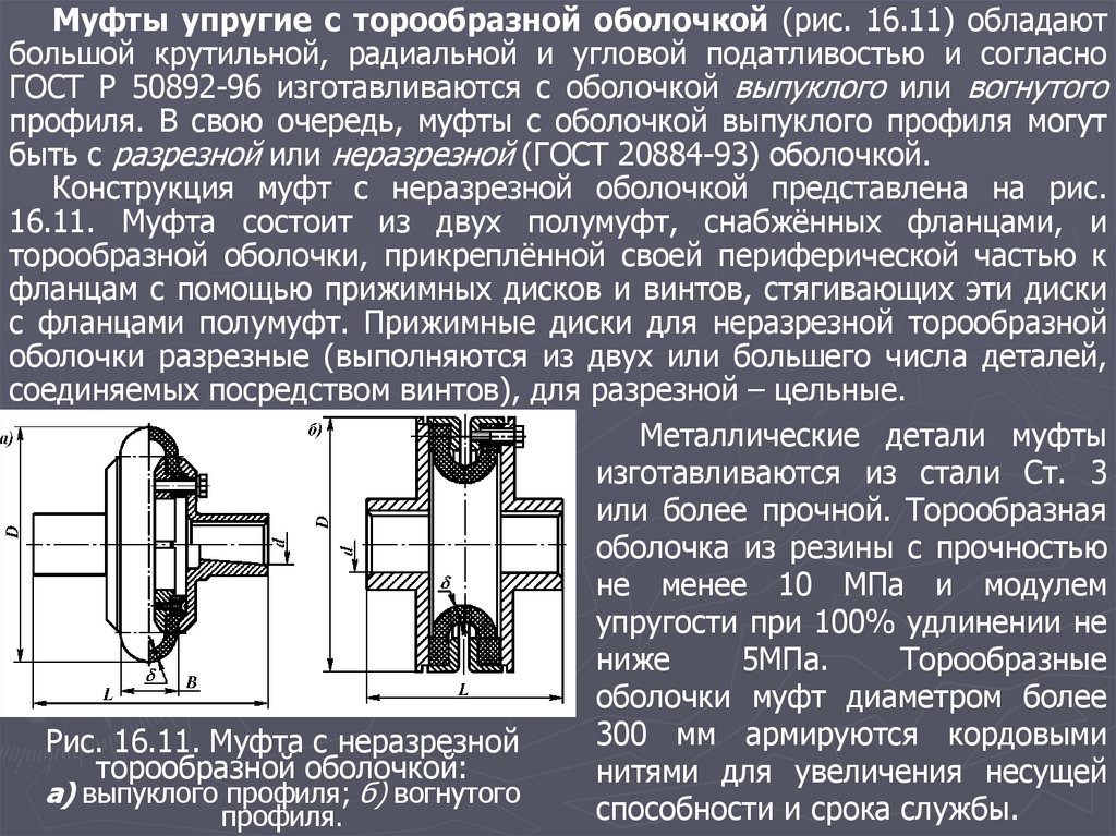 Муфты упругие с торообразной оболочкой (рис. 16.11) обладаютбольшой крутильной, радиальной и угловой податливостью и согласно
