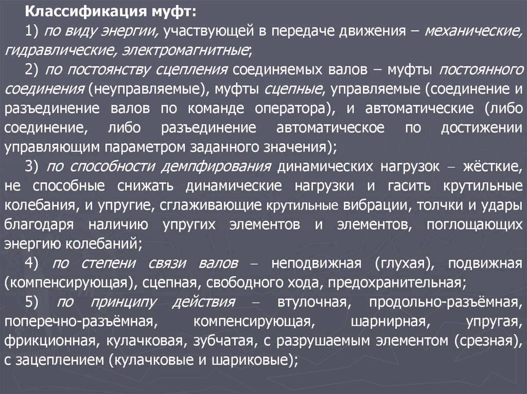 Классификация муфт:1) по виду энергии, участвующей в передаче движения – механические,