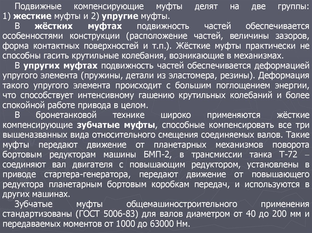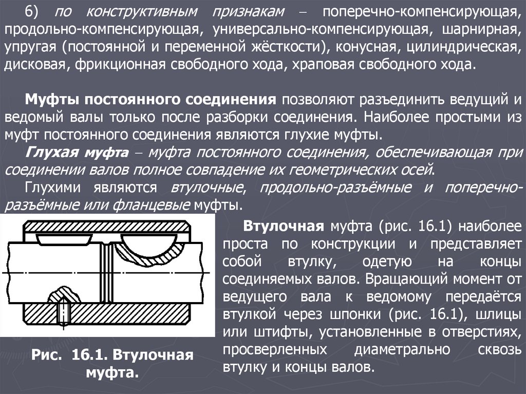 Глухими являются втулочные, продольно-разъёмные и поперечноразъёмные или фланцевые муфты.