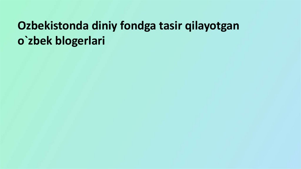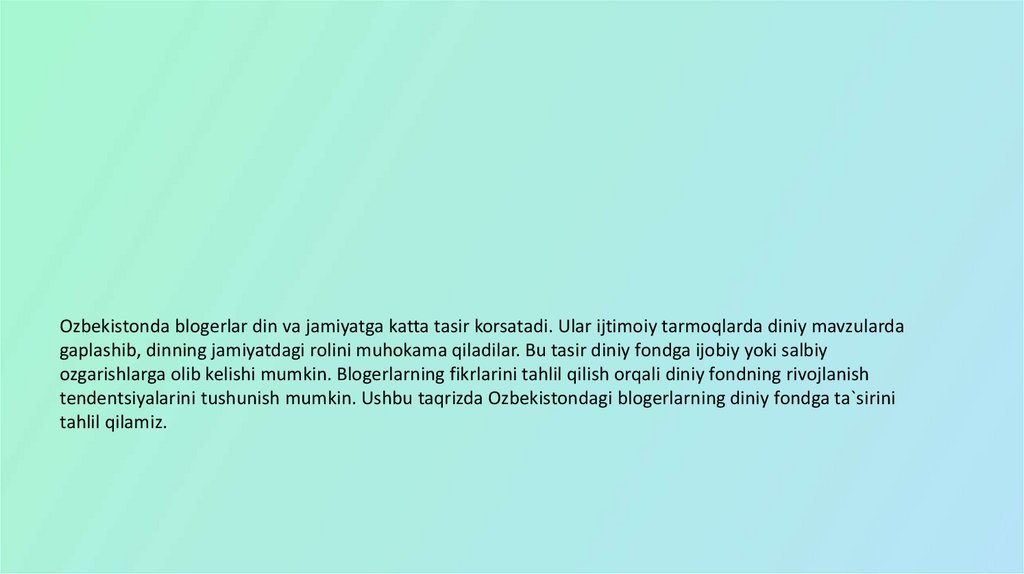 tendentsiyalarini tushunish mumkin. Ushbu taqrizda Ozbekistondagi blogerlarning diniy fondga ta`sirini