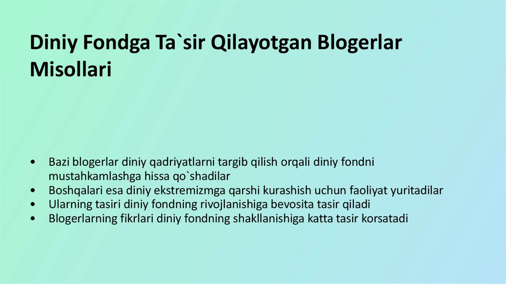 Diniy Fondga Ta`sir MehanizmlariBlogerlarning ta`siri ijtimoiy tarmoqlar orqali tez tarqaladi va keng auditoriya