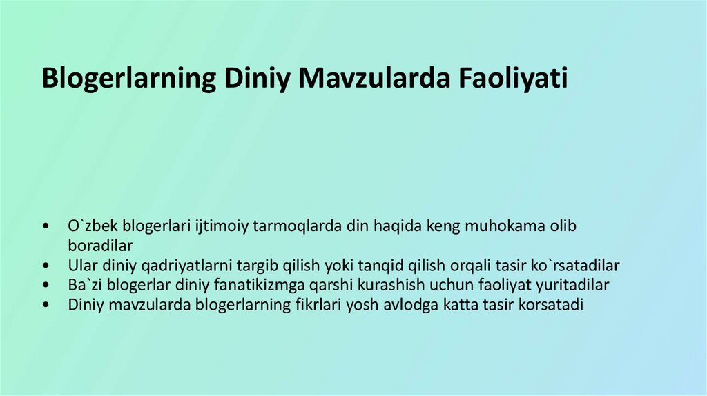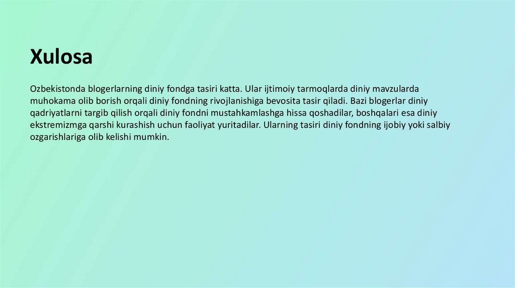 XulosaOzbekistonda blogerlarning diniy fondga tasiri katta. Ular ijtimoiy tarmoqlarda diniy mavzularda
