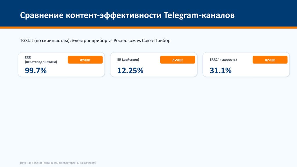 Сравнение контент-эффективности Telegram-каналовTGStat (по скриншотам): Электронприбор vs Росгеоком vs Союз-Прибор