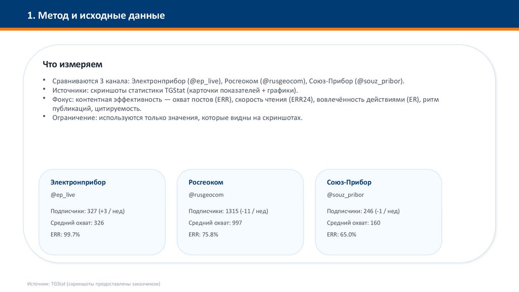 • Сравниваются 3 канала: Электронприбор (@ep_live), Росгеоком (@rusgeocom), Союз-Прибор (@souz_pribor).