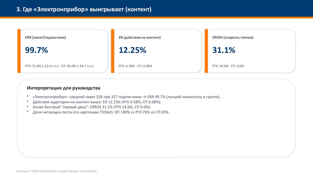 «Электронприбор»: средний охват 326 при 327 подписчиках → ERR 99.7% (лучший показатель в группе).