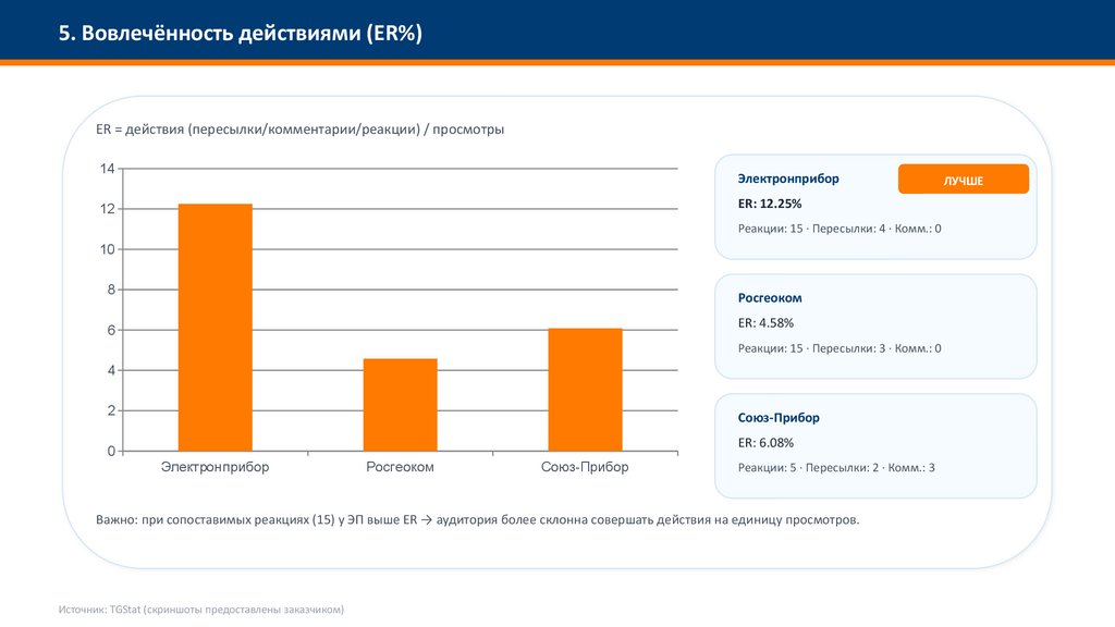 Важно: при сопоставимых реакциях (15) у ЭП выше ER → аудитория более склонна совершать действия на единицу просмотров.