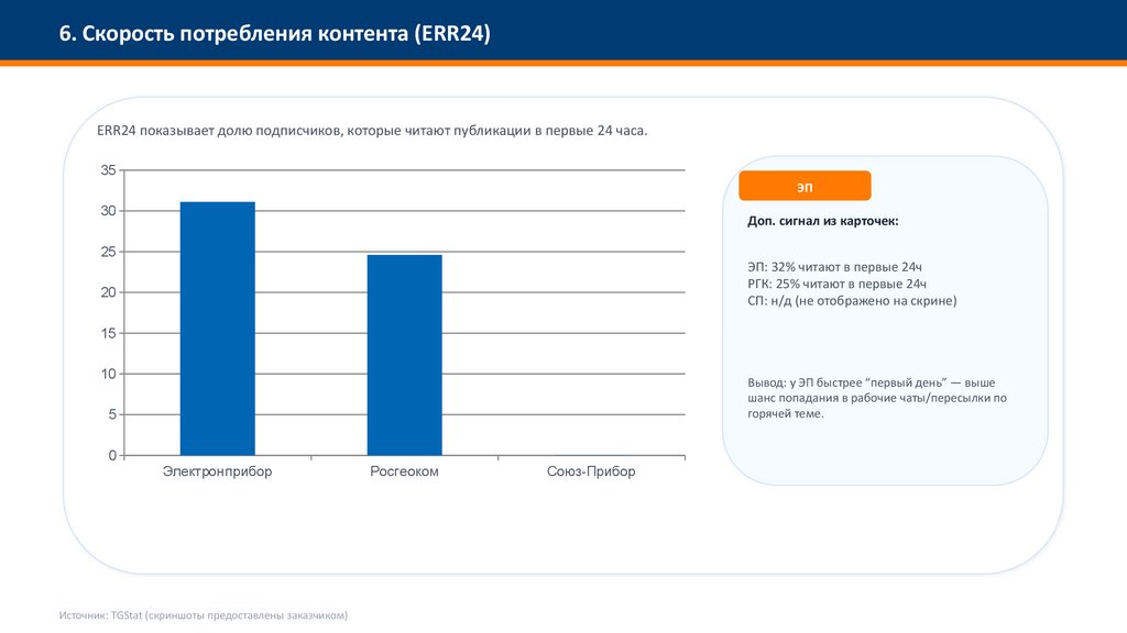 6. Скорость потребления контента (ERR24)ERR24 показывает долю подписчиков, которые читают публикации в первые 24 часа.