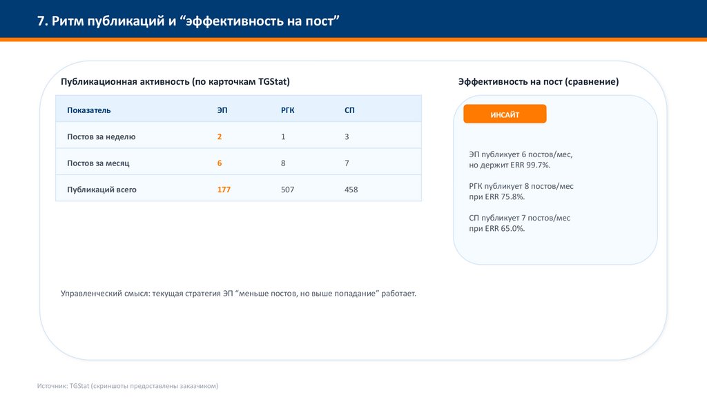 Управленческий смысл: текущая стратегия ЭП “меньше постов, но выше попадание” работает.