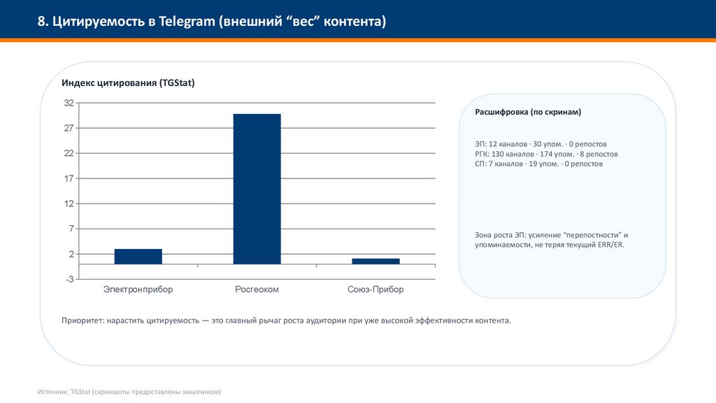 8. Цитируемость в Telegram (внешний “вес” контента)Индекс цитирования (TGStat)