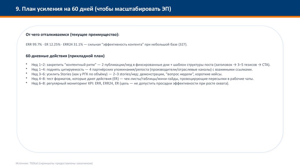 9. План усиления на 60 дней (чтобы масштабировать ЭП)От чего отталкиваемся (текущее преимущество):