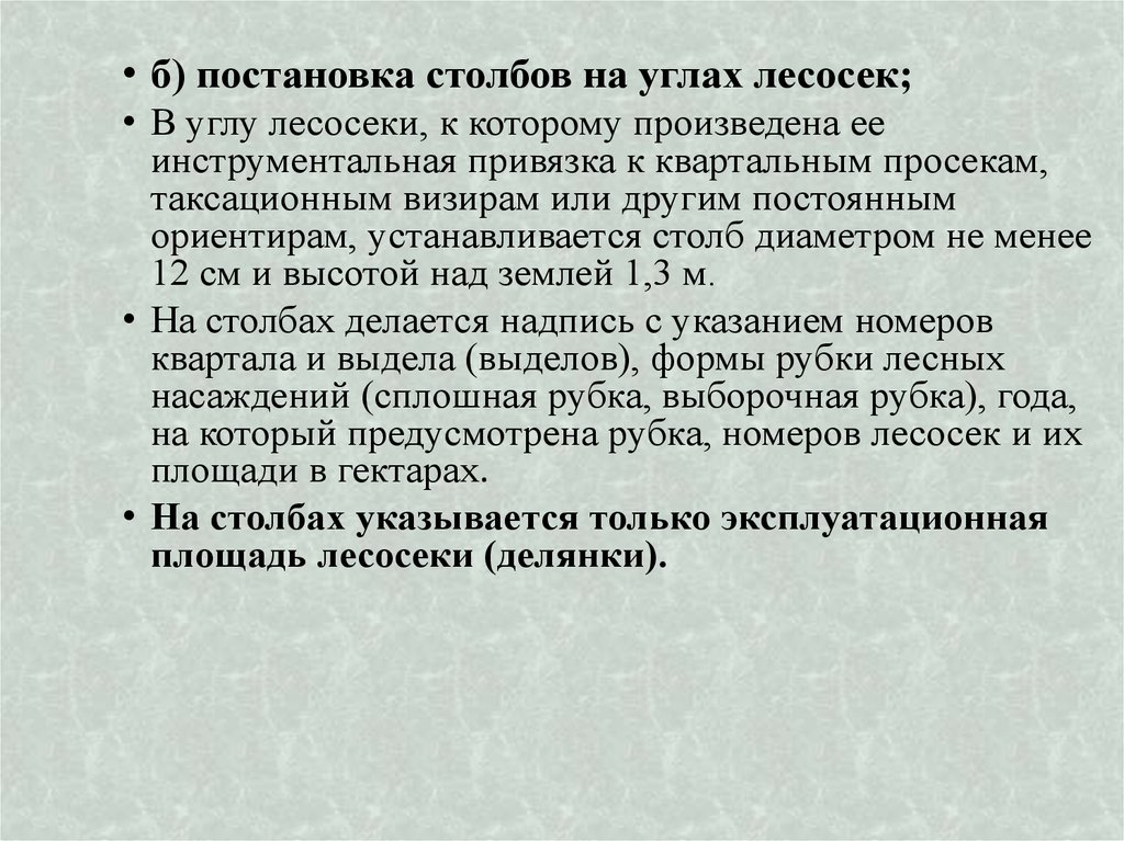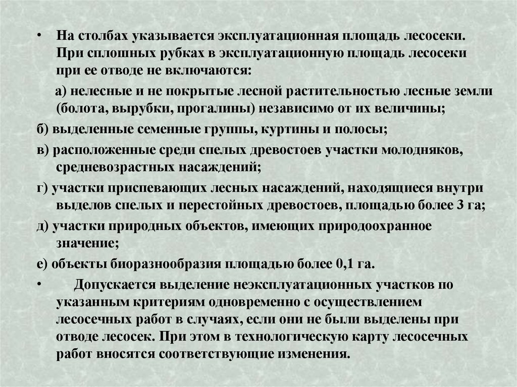 • На столбах указывается эксплуатационная площадь лесосеки.При сплошных рубках в эксплуатационную площадь лесосеки