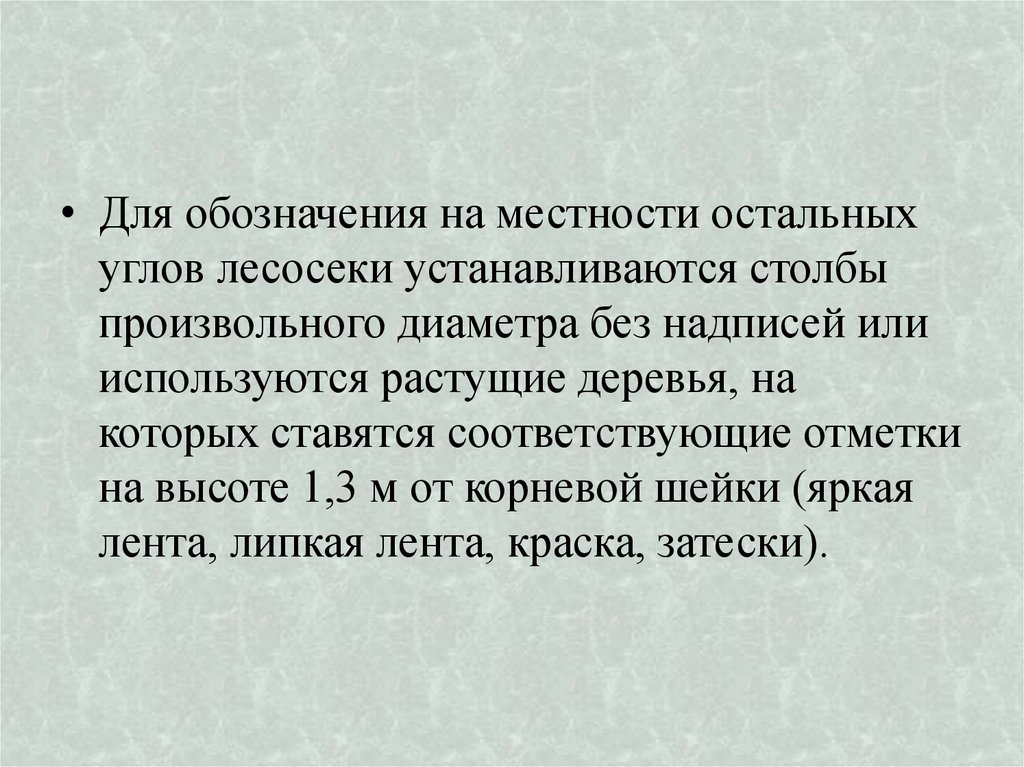 • Для обозначения на местности остальныхуглов лесосеки устанавливаются столбы