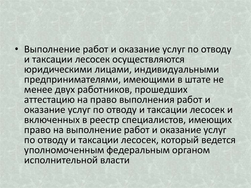 • Выполнение работ и оказание услуг по отводуи таксации лесосек осуществляются