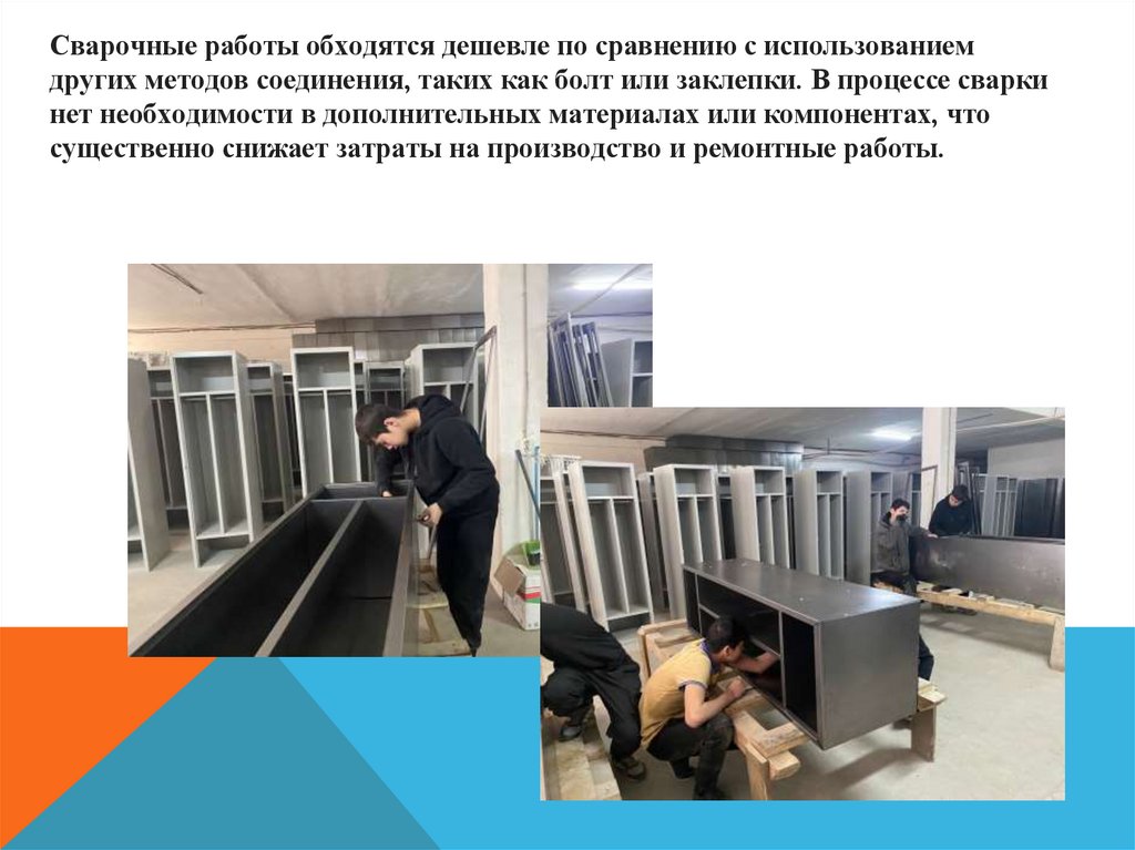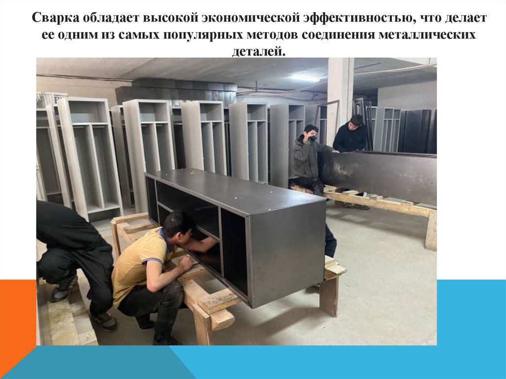 Сварочные работы обходятся дешевле по сравнению с использованиемдругих методов соединения, таких как болт или заклепки. В процессе сварки