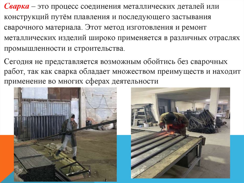 Сварка – это процесс соединения металлических деталей иликонструкций путём плавления и последующего застывания