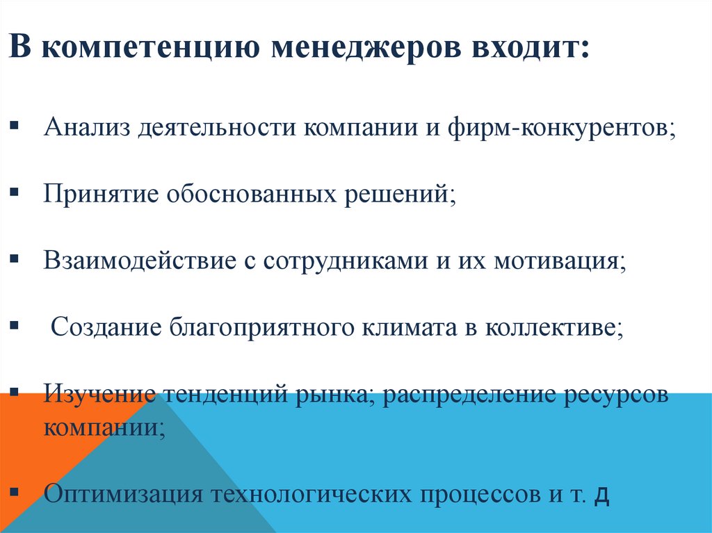 В компетенцию менеджеров входит:Анализ деятельности компании и фирм-конкурентов;