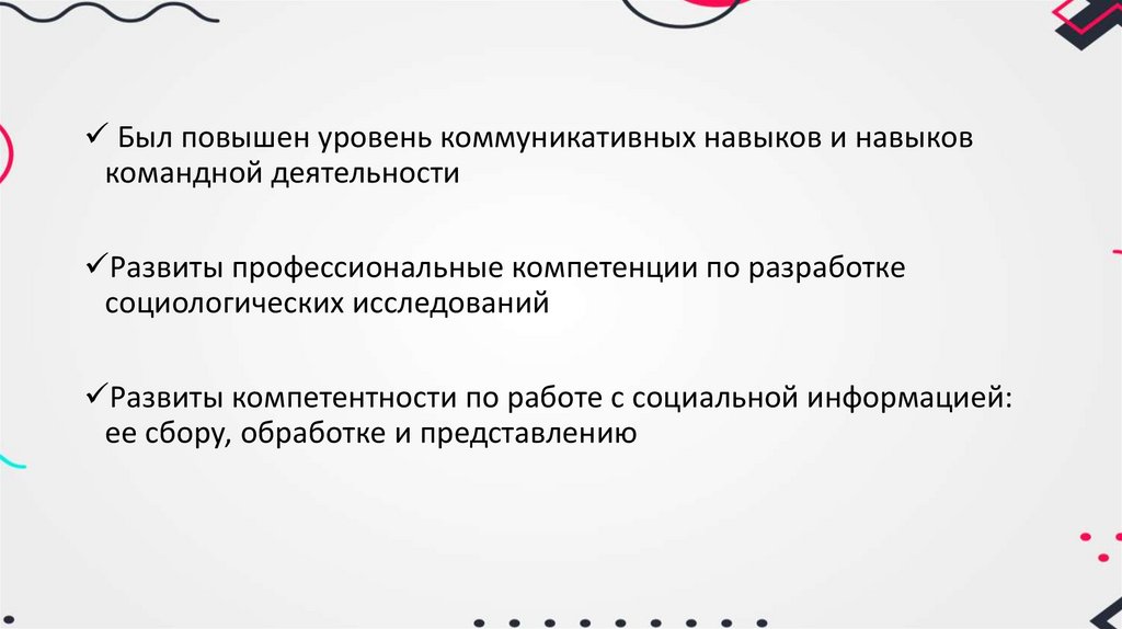 Был повышен уровень коммуникативных навыков и навыковкомандной деятельности