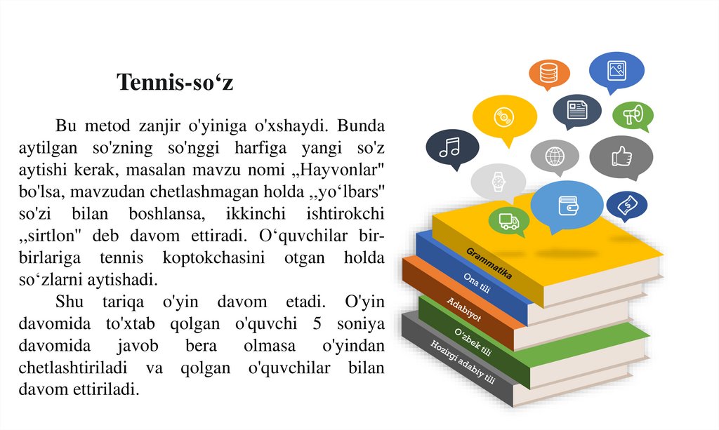 Tennis-so‘zBu metod zanjir o'yiniga o'xshaydi. Bunda