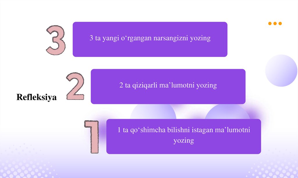 3 ta yangi o‘rgangan narsangizni yozing2 ta qiziqarli ma’lumotni yozing