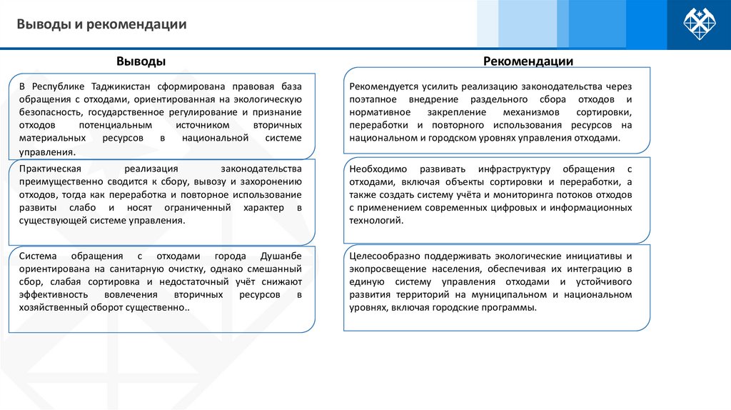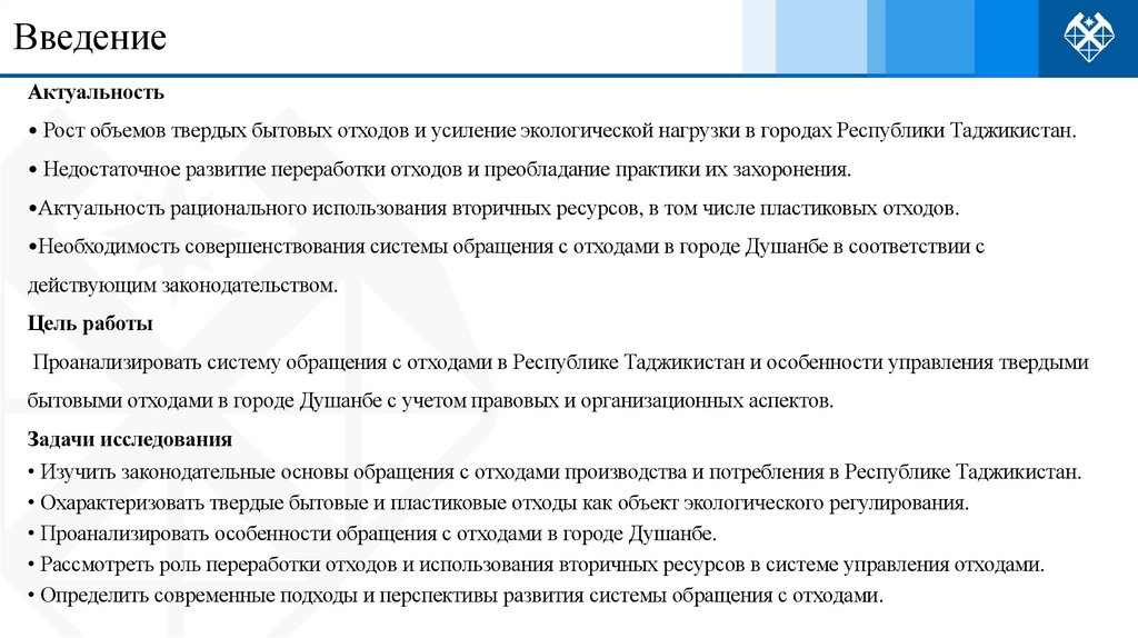 • Изучить законодательные основы обращения с отходами производства и потребления в Республике Таджикистан.