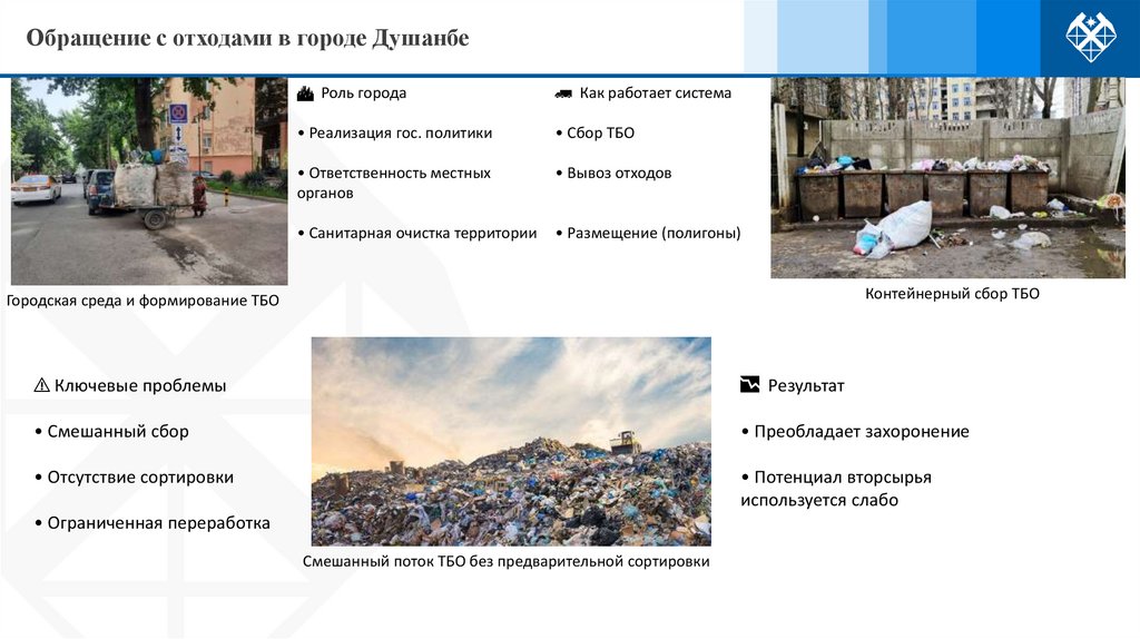 • Рост объемов твердых бытовых отходов и усиление экологической нагрузки в городах Республики Таджикистан.