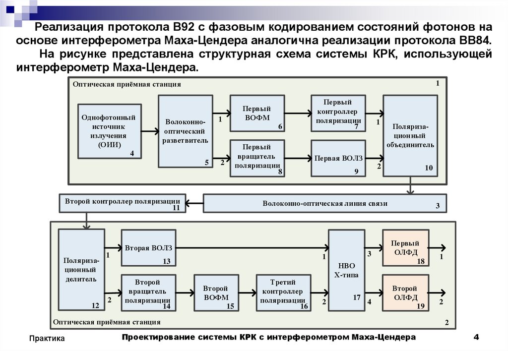 Реализация протокола В92 с фазовым кодированием состояний фотонов наоснове интерферометра Маха-Цендера аналогична реализации протокола ВВ84.
