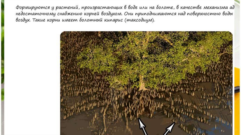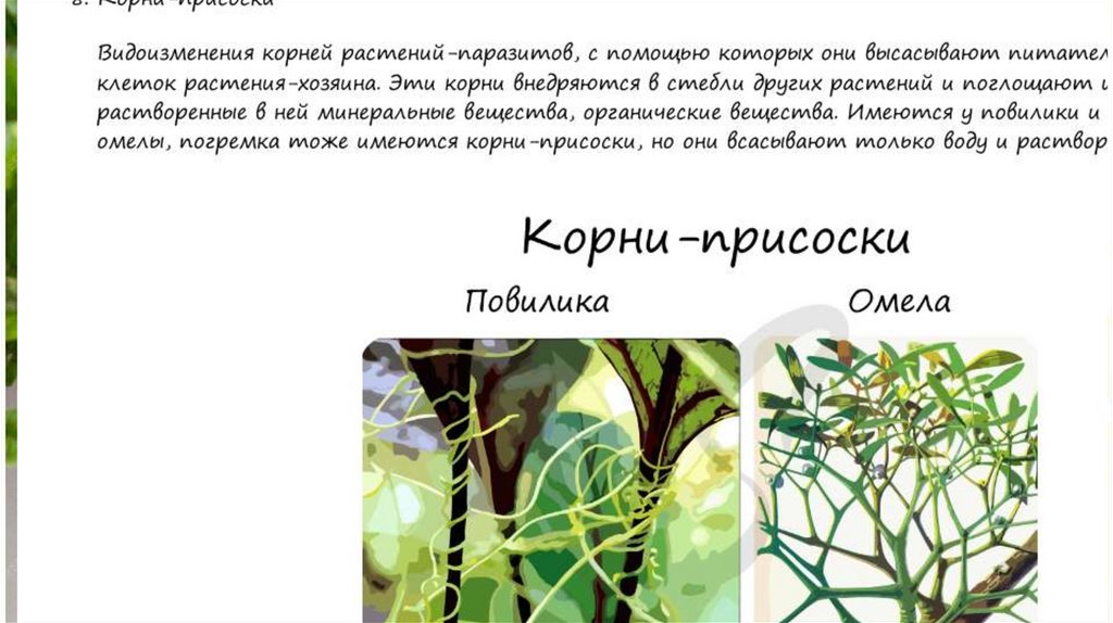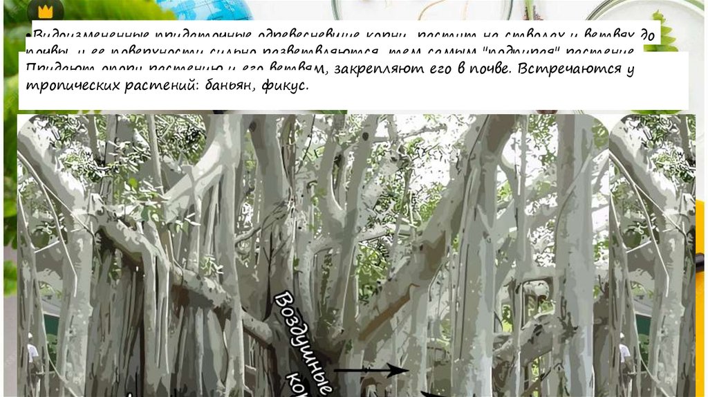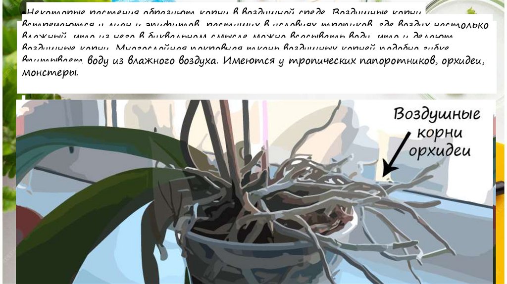 Некоторые растения образуют корни в воздушной среде. Воздушные корнивстречаются у лиан и эпифитов, растущих в условиях тропиков, где воздух настолько