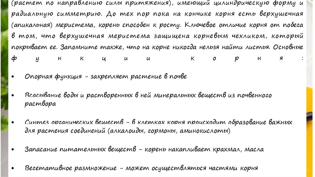 (растет по направлению силы притяжения), имеющий цилиндрическую форму ирадиальную симметрию. До тех пор пока на кончике корня есть верхушечная