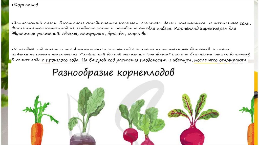 КорнеплодЗапасающий орган, в котором складируется крахмал, сахароза, белки, клетчатка, минеральные соли.