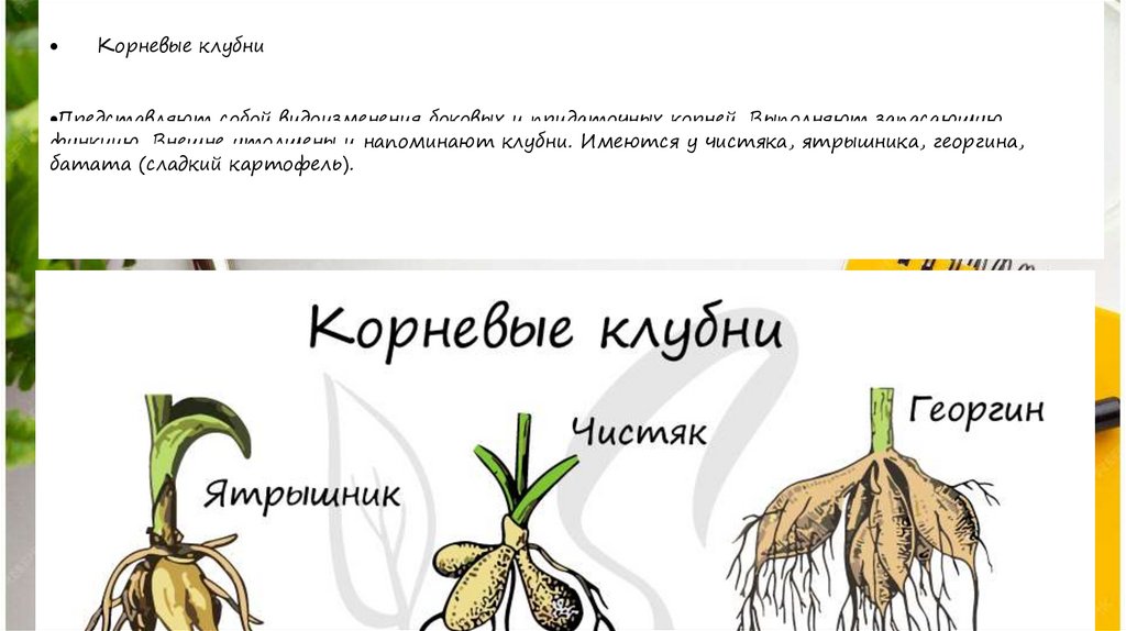 функцию. Внешне утолщены и напоминают клубни. Имеются у чистяка, ятрышника, георгина,