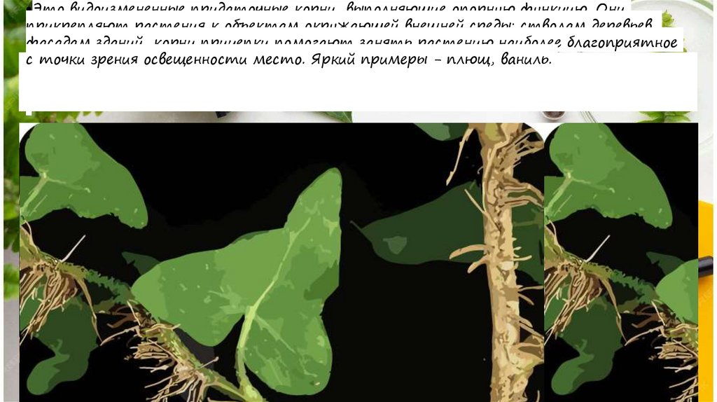 Это видоизмененные придаточные корни, выполняющие опорную функцию. Ониприкрепляют растения к объектам окружающей внешней среды: стволам деревьев,
