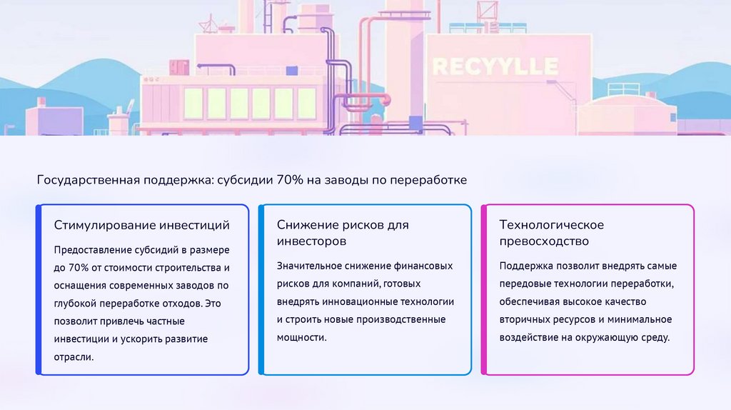 Государственная поддержка: субсидии 70% на заводы по переработкеСнижение рисков для