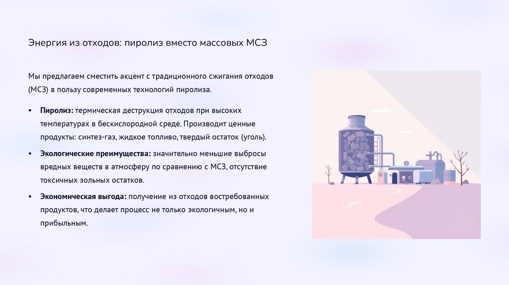 Энергия из отходов: пиролиз вместо массовых МСЗМы предлагаем сместить акцент с традиционного сжигания отходов