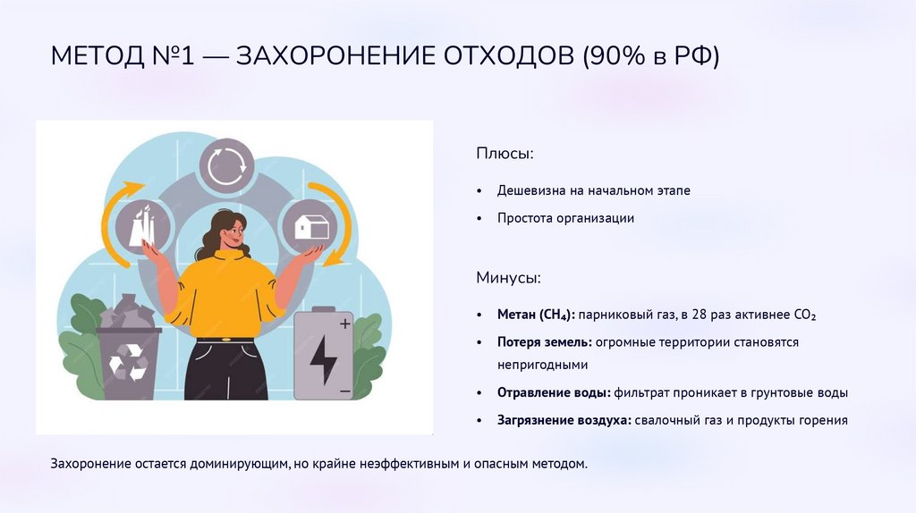 МЕТОД №1 — ЗАХОРОНЕНИЕ ОТХОДОВ (90% в РФ)Плюсы: