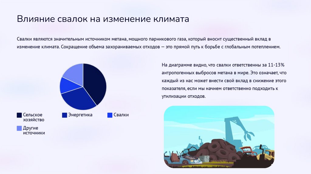 Влияние свалок на изменение климатаСвалки являются значительным источником метана, мощного парникового газа, который вносит существенный вклад в