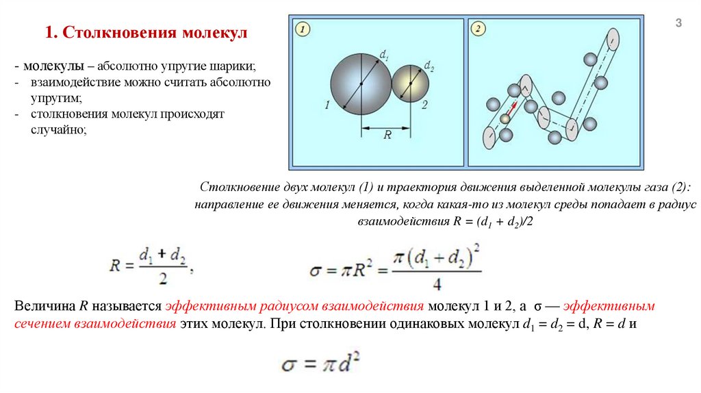 сечением взаимодействия этих молекул. При столкновении одинаковых молекул d1 = d2 = d, R = d и