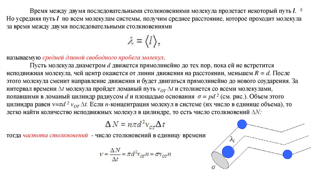 Время между двумя последовательными столкновениями молекула пролетает некоторый путь l. 4Но усредняя путь l по всем молекулам системы, получим среднее расстояние, которое проходит молекула