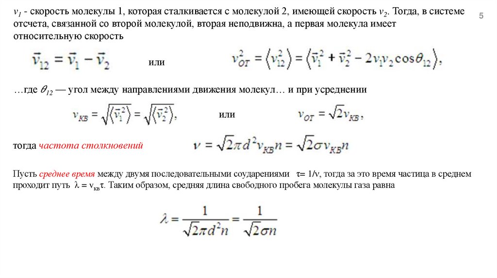 v1 - скорость молекулы 1, которая сталкивается с молекулой 2, имеющей скорость v2. Тогда, в системеотсчета, связанной со второй молекулой, вторая неподвижна, а первая молекула имеет