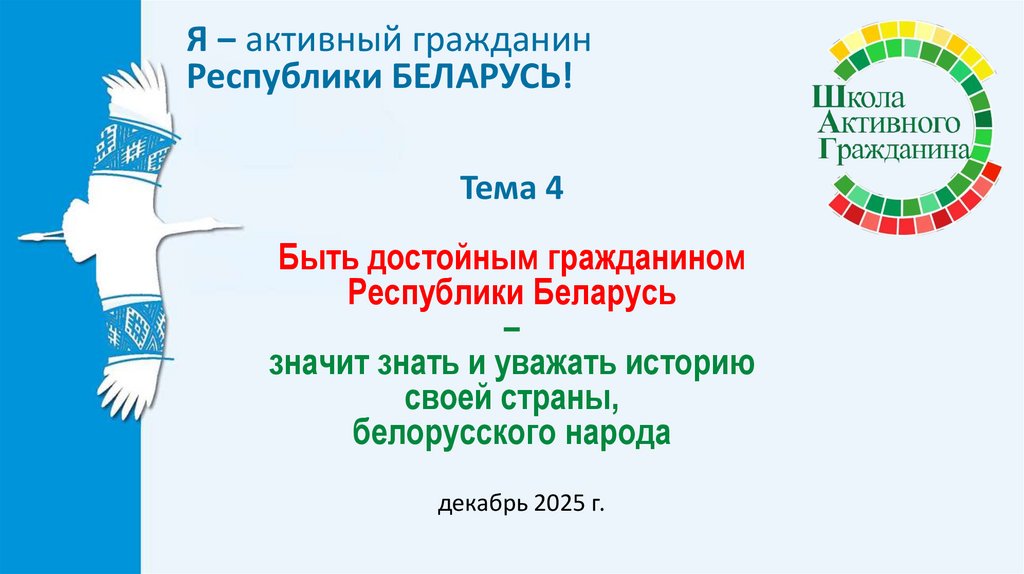 1. Тема 4 Быть достойным гражданином Республики Беларусь – значит знать и уважать историю своей страны, белорусского народа
